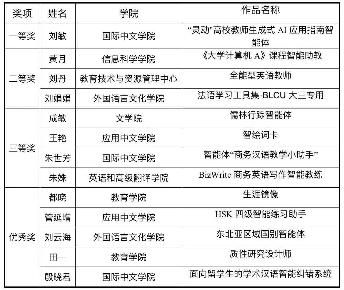 为贯彻国务院关于深入实施“人工智能+”行动的意见,深化人工智能在教育领域的创新应用,提升师生数字素养与数字化教育教学应用能力,学校举办了首届“人工智能+教育”应用创新大赛。本次大赛自启动以来,得到全校师生的积极响应与热情参与,参赛师生围绕赛事主题设计了多款贴合教育教学的智能体作品,充分展现了北语师生在“人工智能+教育”领域的创新思维与实践能力。经大赛评审委员会专业评审,现将获奖结果公示如下: